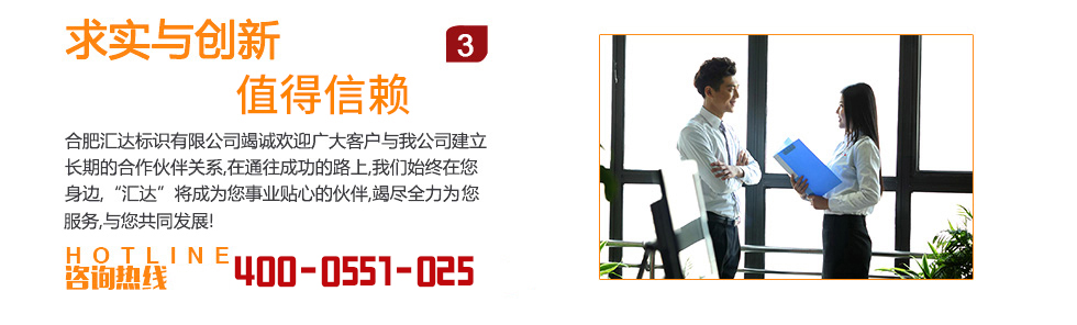 合肥匯達(dá)標(biāo)識(shí)有限公司 ??合肥匯達(dá)標(biāo)識(shí)有限公司成立于2005年3月15日是從事現(xiàn)代標(biāo)識(shí)、雕塑、信報(bào)箱、景觀(guān)小品等整體規(guī)劃,設(shè)計(jì),制作及安裝于一體的專(zhuān)業(yè)性公司。公司成立了專(zhuān)業(yè)的產(chǎn)品技術(shù)中心和現(xiàn)代化的大型生產(chǎn)廠(chǎng)房。擁有一支由資深設(shè)計(jì)師,工程師,客服代表,熟練技工組成的精英團(tuán)隊(duì),具有一流的設(shè)計(jì)能力和豐富的施工經(jīng)驗(yàn)。目前完成過(guò)項(xiàng)目達(dá)上千個(gè),已成為了眾多房地產(chǎn)公司 ,建筑建設(shè)公司 、園林公司、 設(shè)計(jì)院所 、裝飾公司、廣告公司的長(zhǎng)期供應(yīng)商。 ??服務(wù)過(guò)的客戶(hù)有萬(wàn)達(dá) 龍湖 綠地 碧桂園 融創(chuàng) 旭輝 祥生 榮盛 高速 寶業(yè)等知名地產(chǎn)公司,和順 徽鹽 京東方 安徽名航,中國(guó)科學(xué)院合肥物質(zhì)研究院,安徽省水利水電置業(yè)發(fā)展有限公司等具有國(guó)有背景的知名單位和地產(chǎn)公司。完成了安徽合肥濱湖新區(qū)綠道標(biāo)識(shí)提升 安徽合肥高新豪生酒店 安徽合肥長(zhǎng)江東路憲法主題廣場(chǎng) 安...